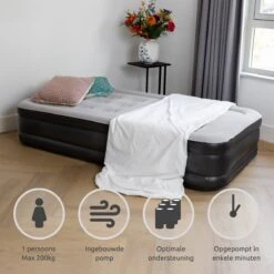 Het luchtbed heeft een zachte bovenkant van grijs velours en een verhoging van 36 cm, zodat u er ‘s nachts niet af kunt rollen en het aanvoelt als een echt bed. Dankzij de naadloze lastechniek en kwalitatieve dikke materiaal is het bed volledig luchtdicht, lekbestendig, waterafstotend en bestand tegen beschadigingen. Bovendien zorgt de antislip onderkant voor extra stevigheid.