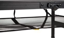 Kleur: zwart en bruin Materiaal: MDF en aluminium Afmetingen: 120 x 80 x 70 cm (L x B x H) Afmetingen (ingeklapt): 80 x 60,5 x 7 cm (L x B x H) In hoogte verstelbaar: 37/70 cm Compact en stevig Extra fijne afstelling met de draaischroeven Verwijderbare poten Deelbaar blad Stevig handvat Met een net voor het opbergen van spullen Gewicht: 7,2 kg Eenvoudig mee te nemen als koffer