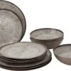 Een 16-delig servies van 100% melamine. Melamine servies is vrijwel onbreekbaar en zeer licht van gewicht. Daarnaast is het servies kraswerend en vaatwasmachinebestendig. Deze stijlvolle set is geschikt voor 4 personen en bestaat uit 4 borden, 4 ontbijtbordjes, 4 kommen en 4 mokken.