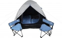 De Camping Set bestaat uit een ruime monodome kampeertent, twee comfortabele slaapzakken en twee opvouwbare campingstoelen. De Camping Set is voor uw gemak verpakt in een hoogwaardige en duurzame draagtas met ritssluiting. Gebruik de campingstoelen om te ontspannen en een heerlijk kampeerfeest te bereiden