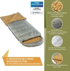 Uitgerust met een 2-laags 200 g/m² microvezel vulling, is de Dundee een 3-seizoenen slaapzak en geschikt voor comforttemperaturen van 12 – 2°C. Het royale hoofdgedeelte heeft een opening van 14 cm. Het royale hoofdgedeelte heeft een 14 cm hoge rand met trekkoord om volledig in te kunnen kruipen en hoofd en schouders lekker warm te houden. De speciale kamerconstructie van de vulling zorgt ervoor dat deze altijd goed verdeeld blijft en niet wegglijdt, zelfs niet tijdens het wasproces. Wassen in de wasmachine is mogelijk op 30°C op het zachte programma en zorgt ervoor dat de slaapzak grondig wordt opgefrist zonder dat de kleuren verbleken.
